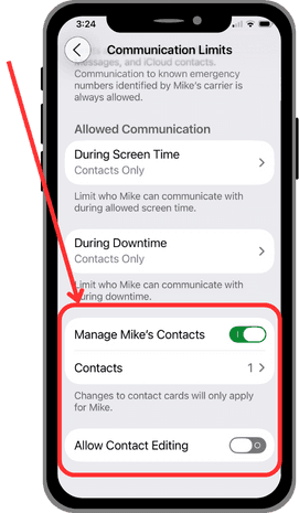 Additionally, you can disable Allow Contact Editing to prevent your child from changing their existing Contacts without permission.