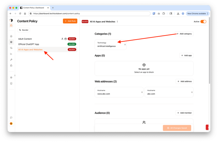 To get started, it's important to limit the pool of available AI chat apps to only ChatGPT. The best way to do this is using a "default-deny" blocking approach.