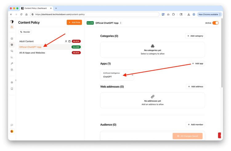 The effect of this is that even if a ChatGPT wrapper application is downloaded from the App Store, it won't be able to connect to the internet. This saves you from having to maintain a massive list of AI websites that you need to block (an impossible task). Then, only ChatGPT is unblocked and you can narrow the scope of use to the app where a child must be signed in.